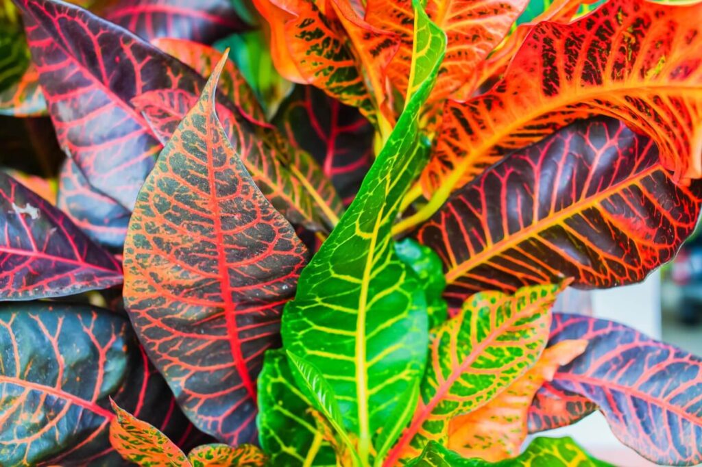 Le croton bush on fire a des feuilles vibrantes tachetées de jaune, de vert, de rose, de rouge, etc. Veillez à ce que la plante reçoive beaucoup de soleil indirect si vous voulez des couleurs vives.