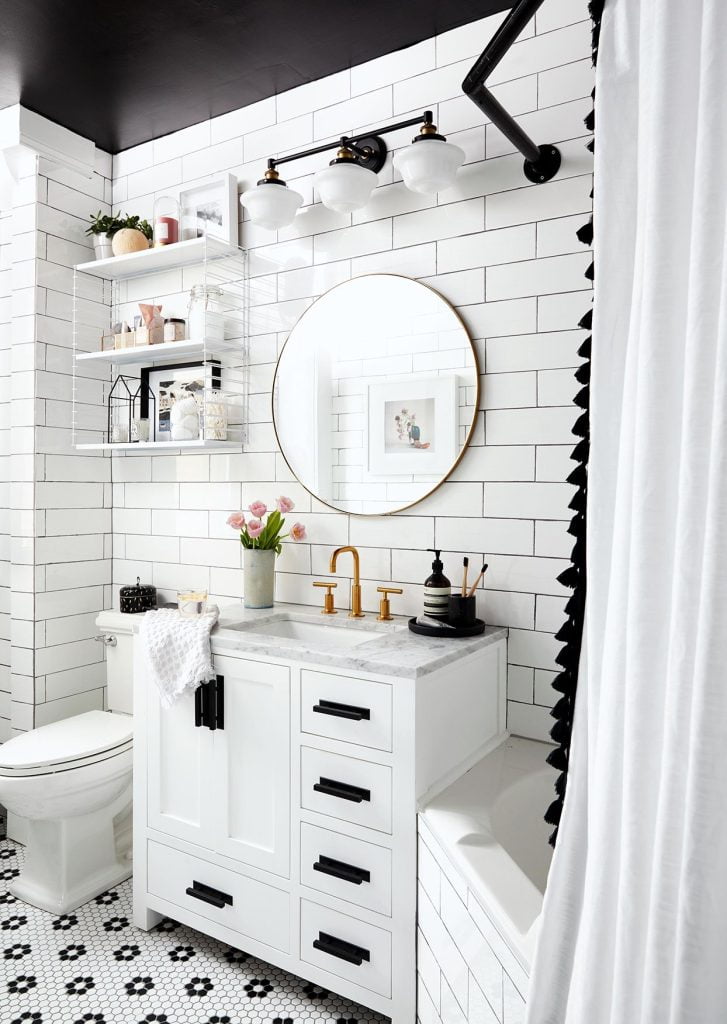 Trouvez le bon équilibre dans une petite salle de bains en noir et blanc en utilisant chaque couleur sur les grandes surfaces, comme les murs en carreaux de métro blancs et le plafond noir ici, ainsi que sur les petits accents. Incorporez des formes et des motifs différents, comme le miroir rond, le rideau de douche à pompons ou le carrelage hexagonal de cette pièce, pour rendre l’espace plus intéressant sans ajouter de couleurs supplémentaires.