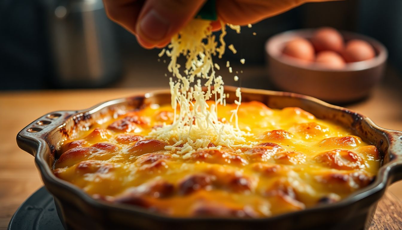 Commencez par râper la muscade, puis ajoutez une fine couche de parmesan fraîchement râpé. Ce dernier protège la muscade de la chaleur tout en offrant une croûte dorée exceptionnelle.