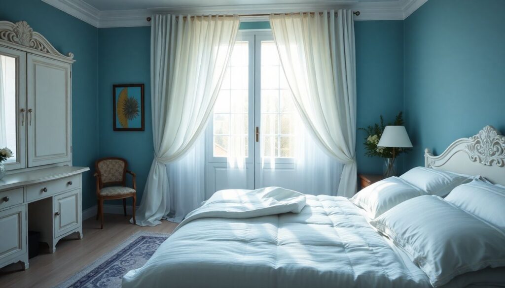 Le choix des draps joue également un rôle important. Utiliser des draps en lin blanc ou bleu clair prolonge l’harmonie des couleurs et favorise une régulation thermique optimale durant la nuit.