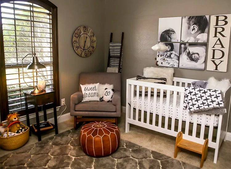 Alors gardez l’esthétique dans une nuance de brun et de gris – comme dans l’image ci-dessous. Ici, le designer a utilisé différentes nuances de marron, non seulement dans la peinture murale, mais aussi dans les meubles et les accessoires. Dans cette pièce, le designer a également ajouté de nombreuses touches personnelles. Il s’agit notamment des cadres photo sur le mur et du nom de l’enfant.