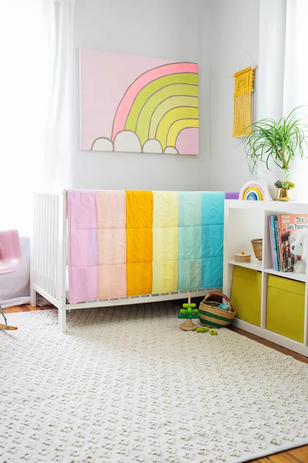 Une autre façon de créer une chambre d’enfant non genrée est d’adopter toutes les couleurs au lieu de s’en tenir à des teintes unies ! Les enfants adorent les couleurs – et la vivacité de nombreuses couleurs peut être étonnante sur un mur blanc uni et des meubles blancs.