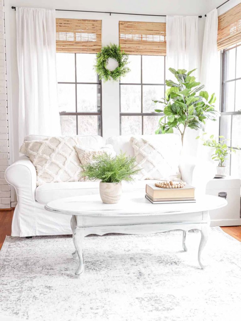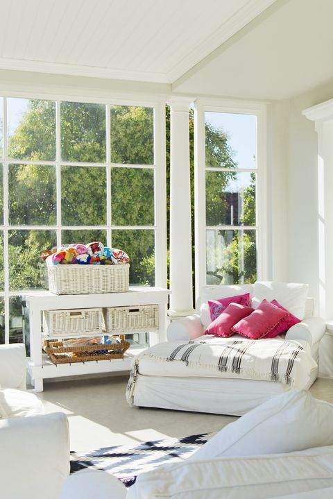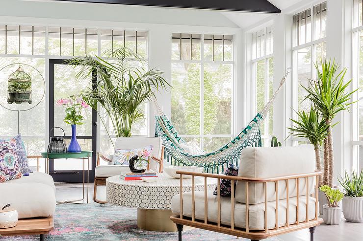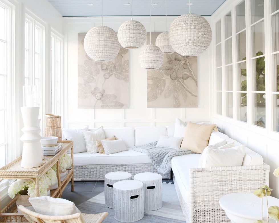 Un relooking avec les bonnes couleurs de peinture peut convertir votre salon en une véranda grillagée ou en une pièce de saison sectionnelle décorée avec des tissus d’ameublement, des chaises en osier et des meubles en osier pour une sensation de véranda toute l’année.