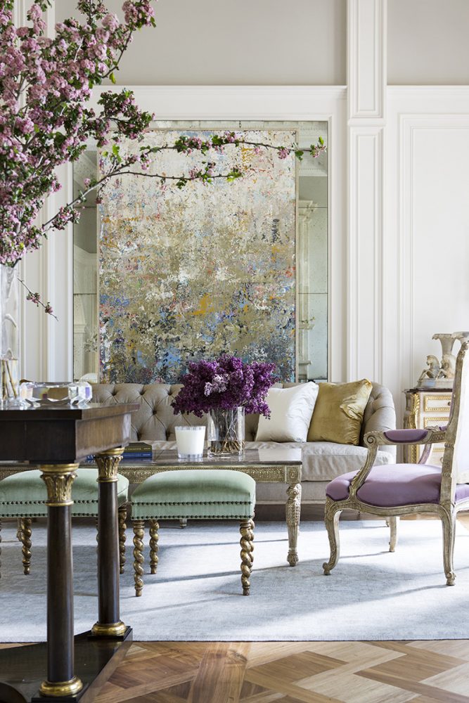 L’art est ajouté pour compléter le look et fait partie intégrante du schéma de décoration. De belles abstractions, notamment florales, s’accordent parfaitement avec le style et sont utilisées pour faire ressortir la personnalité de la pièce.