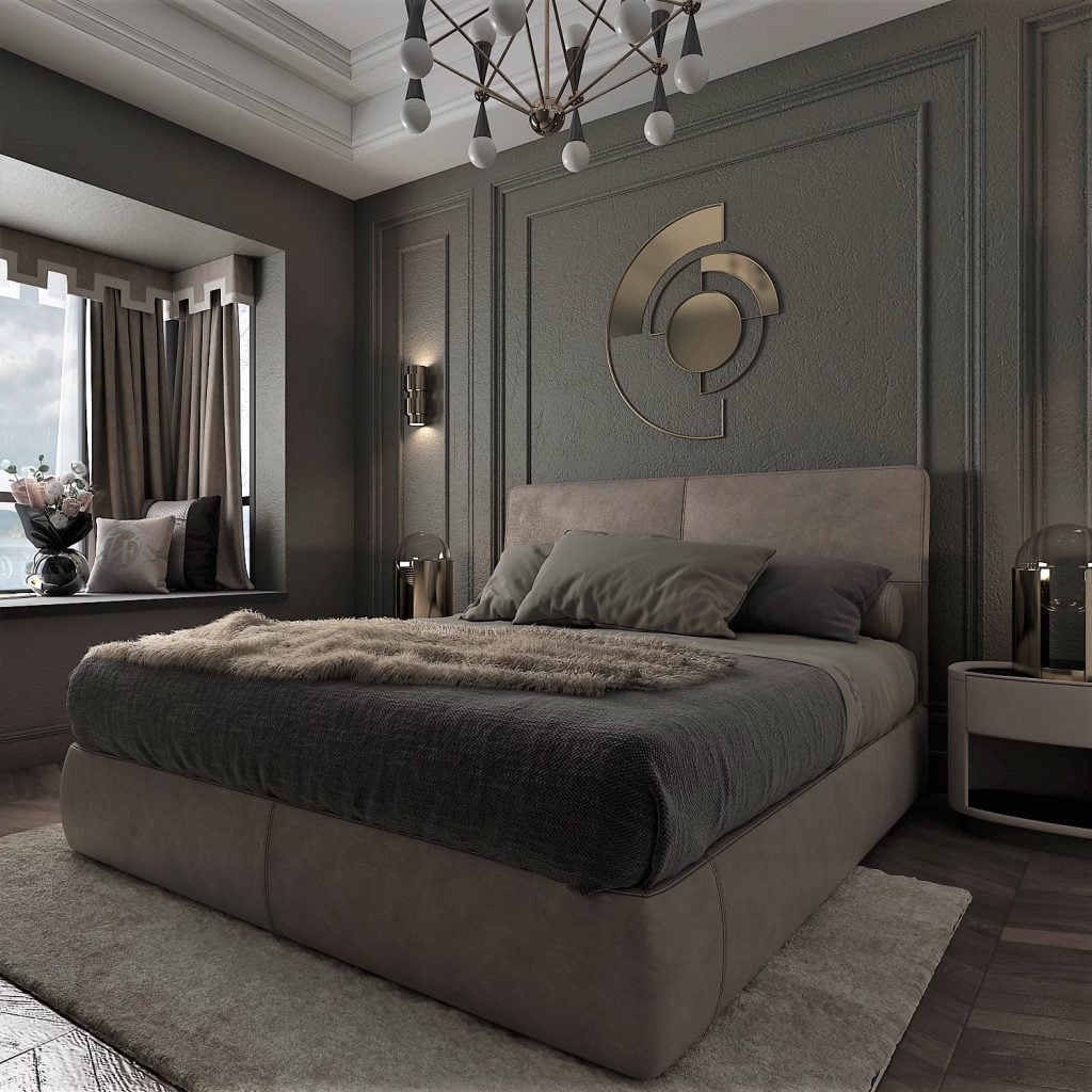 La tête de lit, qui constitue la partie la plus attrayante de la pièce, peut être faite de bois précieux ou d’un vieux portail en fer. Pour rendre la pièce plus chaleureuse et unique, un vieux banc de cinéma peut être placé au bout du lit comme coin salon.