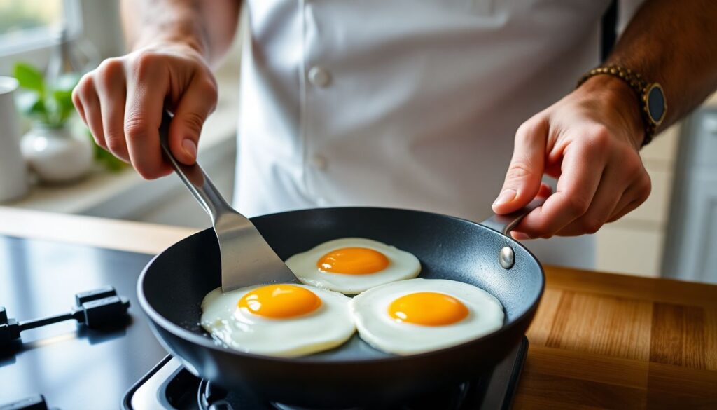 Le retournement de l’œuf est une opération délicate. Les chefs utilisent généralement une spatule fine et souple qu’ils glissent délicatement sous l’œuf en commençant par un de ses bords. L’important est de garder un mouvement fluide pour éviter de percer le jaune.