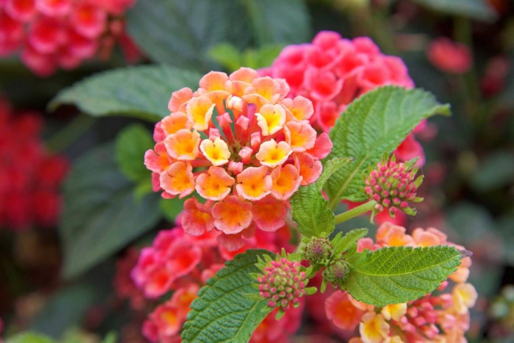 Le lantana commun fleurit avec des grappes de petites fleurs tubulaires en forme de pompon qui ont chacune quatre pétales. Elles fleurissent dans des tons de rouge, rose, orange, jaune et blanc et certaines espèces ont même des fleurs joliment panachées avec un gradient de couleur attrayant à travers leurs fleurs.