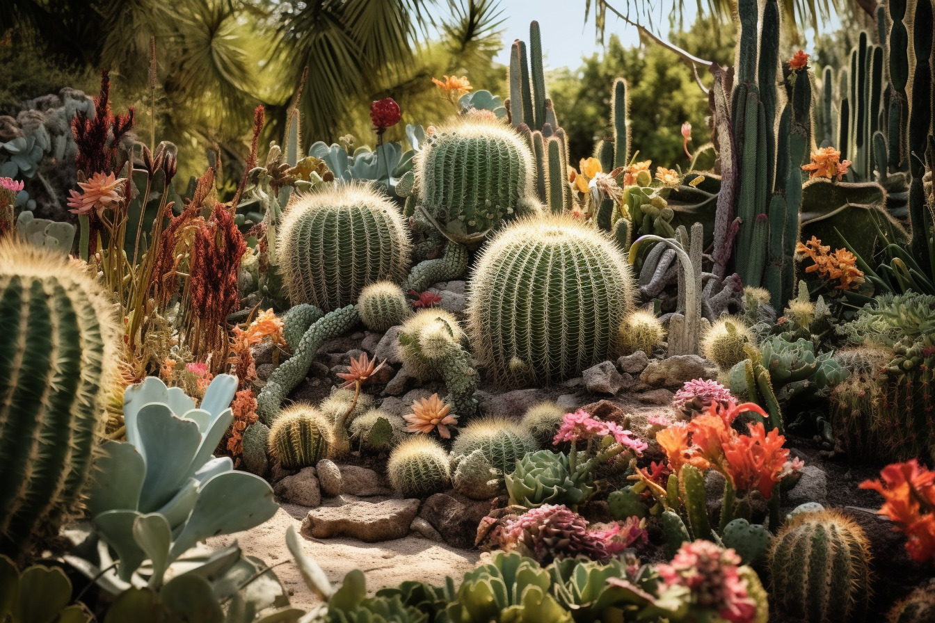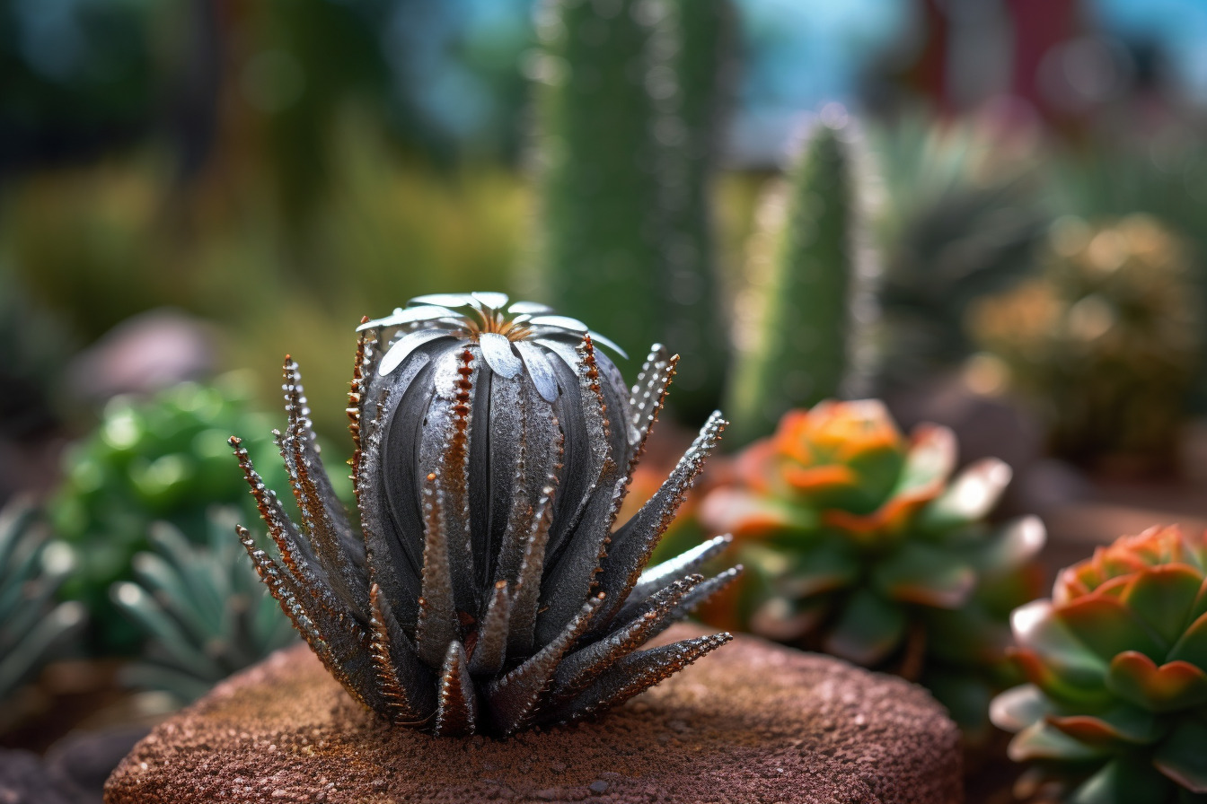 La beauté du contraste : le cactus métal parmi les plantes vivantes