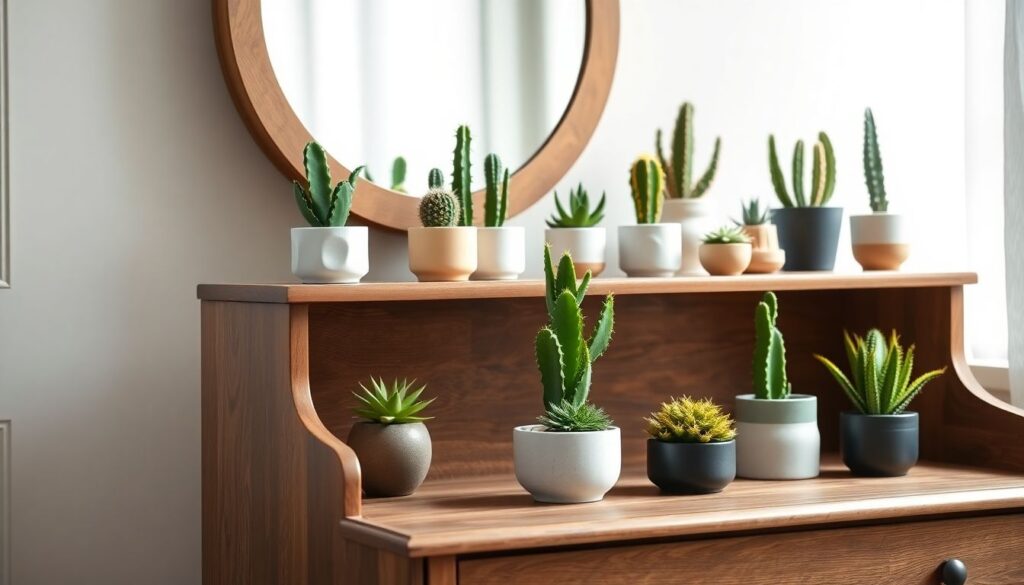 Une commode embellie par des cactus peut devenir un point d’attraction principal dans votre espace de vie. Pour maximiser cet effet, il est préférable de dégager la zone environnante et d’éviter tout encombrement décoratif. Un mur sobre en arrière-plan mettra en évidence les formes uniques de vos plantes, alors qu’un papier peint avec des motifs chargés pourrait désorienter visuellement l’ensemble.