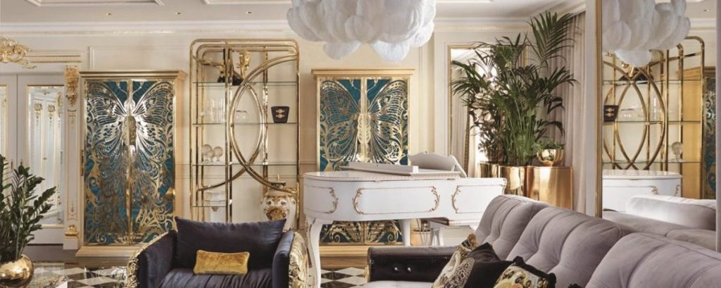 L’Art déco est illustré par l’utilisation de motifs et de matériaux provenant de pays lointains. Ces motifs sont le reflet de la popularité croissante des voyages au sein de l’élite et de la classe moyenne, ainsi que de la fascination du grand public pour les cultures mondiales auxquelles les gens étaient exposés pour la première fois. Les concepteurs de meubles utilisaient fréquemment des bois durs étrangers incrustés d’ivoire ou d’ébène. La quincaillerie en laiton était souvent utilisée pour donner aux meubles un éclat élégant. Les peaux d’animaux (en particulier celles des grands félins) ou les fourrures étaient des éléments décoratifs très appréciés pour la tapisserie. Aujourd’hui, les tapis et les peaux de faux animaux offrent des options Art déco plus durables.