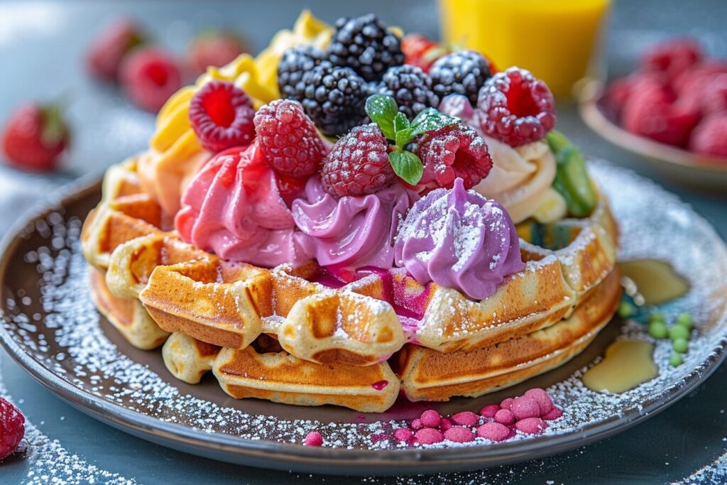 Aujourd’hui, les gaufres se déclinent en une multitude de variations, tant dans leur forme que dans leurs ingrédients. L’introduction des colorants alimentaires pour créer des gaufres colorées apporte une touche de fantaisie et une dimension visuelle qui rend le plat encore plus attrayant, en particulier lors de brunchs festifs ou d’événements spéciaux où l’on cherche à impressionner et à divertir.