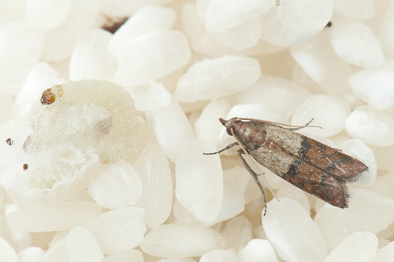 Les mites alimentaires, également connues sous le nom de teignes alimentaires, sont de petits papillons gris ou bruns qui pondent leurs œufs dans les denrées alimentaires, telles que la farine, le riz, les céréales, les fruits secs et les épices. Les larves qui en résultent se nourrissent de ces produits, causant ainsi des pertes et de la contamination alimentaire.