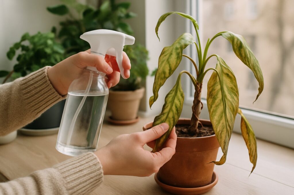 - Rinçage : Vaporisez de l’eau claire sur l’ensemble du feuillage pour un coup de frais.