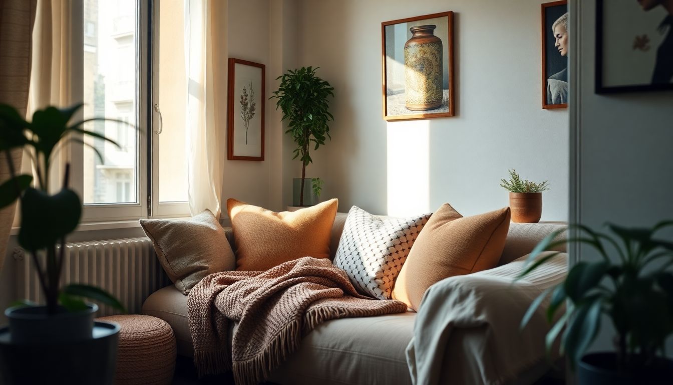 Les textiles sont l’âme d’un espace cocooning. Un plaid doux jeté sur un fauteuil, des coussins aux textures variées, et un tapis qui délimite visuellement l’espace apportent chaleur et confort immédiats.